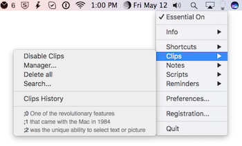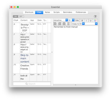 One of the revolutionary features that came with the Mac in 1984 was the unique ability to select text or pictures, etc., then copy that data into a clipboard, in order to hold that content temporarily, and then paste it in the same application or in a different one. The clipboard was used to transfer all kinds of info between programs on the Mac. Later, this feature was adopted into other operating systems. Our app CopyPaste was the first app for the Mac to add multiple clipboards. Essential has this feature as one of it’s abilities called Clips.