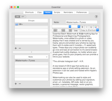 Essential is a multifaceted productivity tool that runs in the background to amplify productivity on the Mac. Essential is the successor to yType. yType was just a text expansion tool. Essential in a centralized utility that gives you multiple clipboards, text expansion, notes, reminders, popups like in iOS, scripting and more, all in one app.