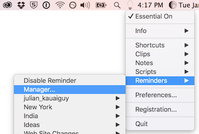 Reminders is a Mac and iOS app by Apple. It can hold reminders and to do lists. It is synchronized between all your personal iPhones, iPads and Macs. Reminders in Essential puts the features of Reminders on the Mac into the menubar for quick access. If you know Reminders on the Mac or iOS then you know how Reminders in Essential works. Here is a screenshot: