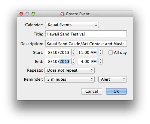 In the TinyCal window, today’s date is circled. In addition, if there are any events occurring today, they are reflected in the menu bar icon. In the following screenshot, the blue triangle in the lower right indicates that there is an event today.