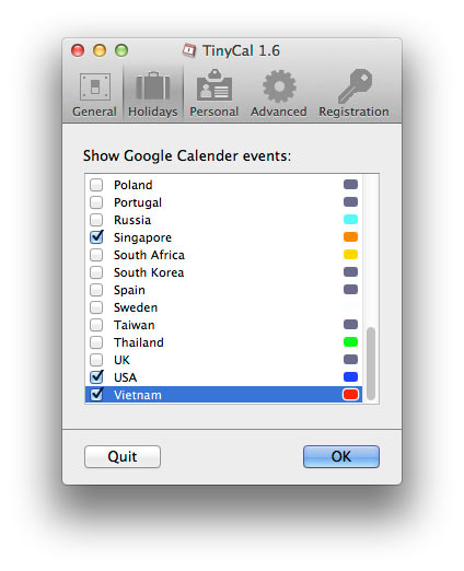 TinyCal can display public Google Calendars for holidays for 40 different countries, from Australia to Vietnam. It can also display events from your personal Google Calendar. The following screenshot shows holidays from the USA in blue and a personal calendar in red.