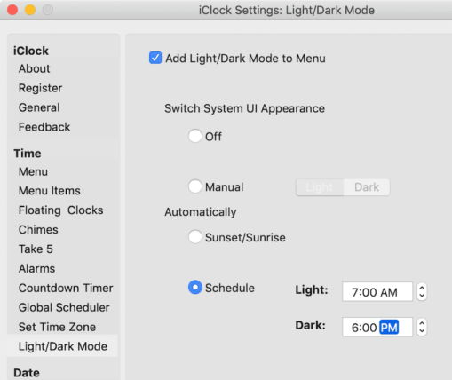 The above preference in iClock is for switching and automation of Apple’s Light/Dark Mode.