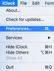 To open Preferences find and select it in the Time Menu see Quick Start (above). Another way to open Preferences is if iClock is the frontmost application select preferences as seen below in the screenshot or type command,