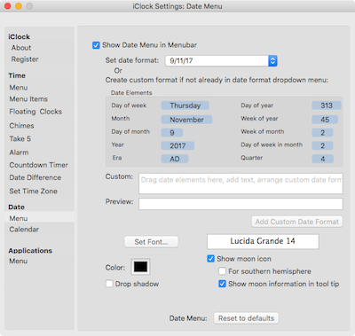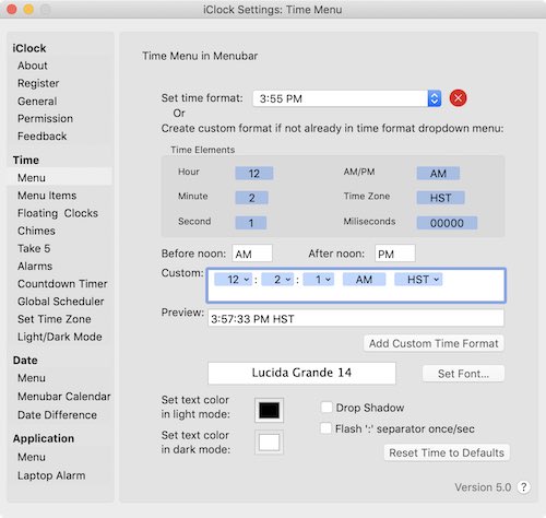 Set Font – change the font, size of the time in the menu bar. Does not change color.