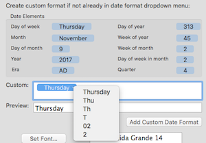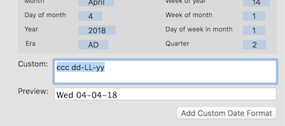Another option is to type the Unicode date codes directly into the ‘Custom:’ field. Those codes like, yyyy.MM.dd G ‘at’ HH:mm:ss zzz can produce a result like 1996.07.10 AD at 15:08:56 PDT.