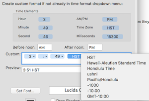 Create custom format – by dragging the blue pills like the one that says Time Zone HST down to the field below called Custom. Once there if the pill has a downward facing triangle and chooses from options like in the screenshot below.