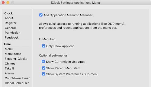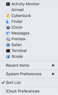 Once installed, click on iClocks Time menu and in that menu select ‘Preferences…’ (screenshot below) to see and change the preferences for the Time, Date, and App menus.
