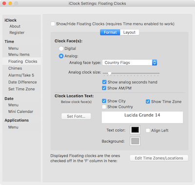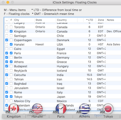 A: In the button Time Zones/Locations seen in the screenshot below you can drag the locations into any order you want to have them display. The ones in the F column are the ones that are displayed for the floating clocks.