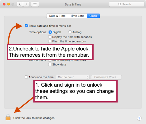 IMPORTANT: To avoid having 2 digital times in the Macs menubar switch Apple’s time to ‘Analog’ icon do this: