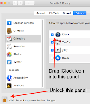 IMPORTANT: sometimes if you have trouble with some permission and iClock is already in this area try unchecking and checking it. This may be a bug in Mac OS.
