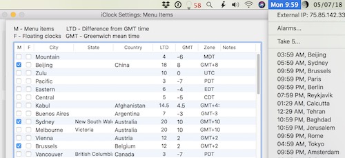 Click to view, add, edit, delete or export cities – click this button to add and remove cities or time zones and to set which ones show up in the time menu and in the floating clocks. See check-marked items below on the left appearing in the time menu on the right. Drag cities up/down in the pref (left) to change their order in the menu (right).