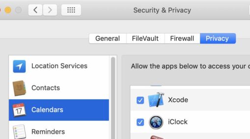 For Apple Calendar: select Apple. To use the Apple Calendar you need to give it permission in the Security & Privacy System Settings panel. To do that open that panel, unlock it and drag iClock’s app icon to the Calendar area of the System Settings:Security & Privacy panel. Seen in the screenshot below.