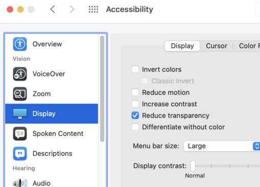 Also if you find that the new transparency of the menu bar in Mac OS 11 is making the fonts disappear because the dark background bleeds thru then you can turn off that transparency in this System Pref:Accessibility:Display and turn off by selecting ‘Reduce transparency’ seen in screenshot below.