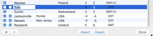Click to view, add, edit, delete or export cities – click this button to add and remove cities or time zones and to set which ones show up in the time menu and in the floating clocks. See check-marked items below on the left appearing in the time menu on the right. Drag cities up/down in the pref (left) to change their order in the menu (right).