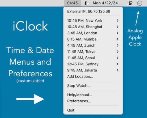 Click on the Time and you will see a long menu with some times in cities worldwide and towards the bottom the iClock preferences. Read on to learn more.