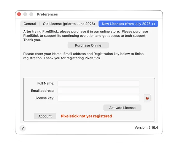 If you purchase after July 2025, make sure to enter the new store license on the registration page in the PixelStick preferences. Highlghted and seen in this screenshot. Or if you purchased before June 2025 then tap on the tab that says, ‘Old License’.![]()